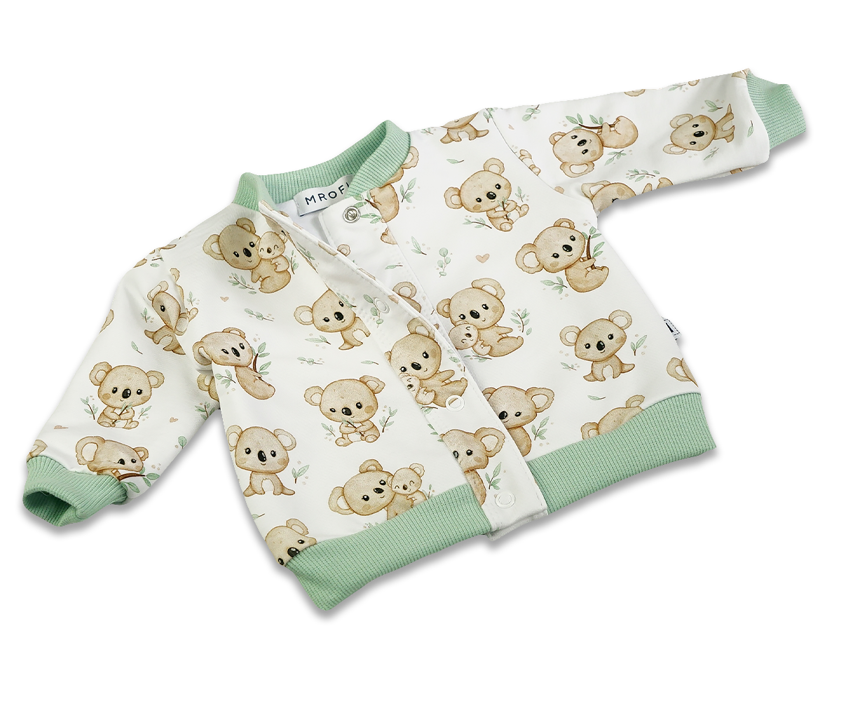 - Bluza rozpinana z przodu na napki, wykończona miękkim ściągaczem przy rączkach i przy szyjce.