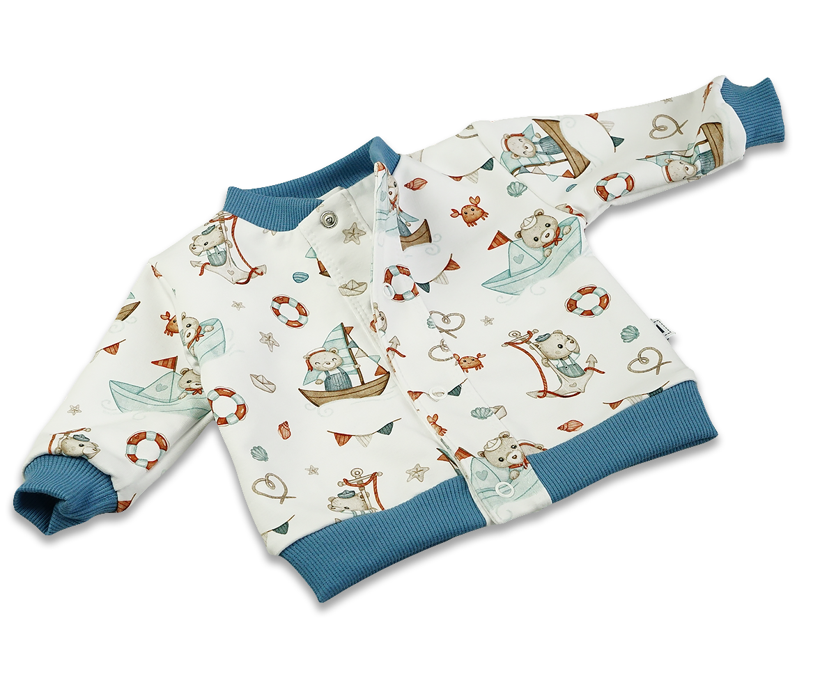 - Bluza rozpinana z przodu na napki, wykończona miękkim ściągaczem przy rączkach i przy szyjce.
